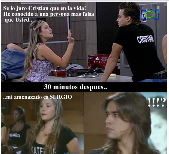 - Yo necesito recordar. Estábamos solitos en la cocina tu y yo nada más. Yo estaba como preparando un jugo de naranja, lo recuerdas o algo así, yo iba a agarrar algo de la nevera, agarré un vaso e iba a entrar en la alacena, tu entraste primero a la alacena y después entré yo…a mi no me gusta hablar de eso…no es nada personal, solo que esa situación no me gustó …a mi me da vergüenza hablar de eso…la alacena es un sitio donde todos nos alimentamos de ahí y sentí un olor como cuando uno está mal del estómago y le dan ganas de pearse”. María Angélica Salgado, dando vueltas para decirle a Cristian que votó por él porque se ventoseó.