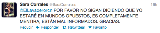 Mucho se ha hablado sobre los famosos que posiblemente participen en el nuevo reality del canal RCN Mundos opuestos, nombres rondan los oídos de los chismosos y de los medios. Sin embargo uno de los más recientes rumores sobre la participación de Sara Corrales, publicado en El lavadero, en el programa fue desmentido por ella misma desde su cuenta de twitter.